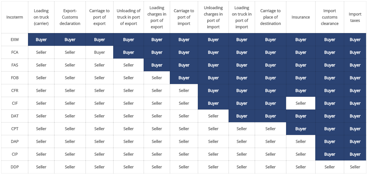 Seller must pay the costs and freight to bring the goods to the port of destination. However, risk is transferred to the buyer once the goods are loaded on the vessel (this rule is new!). Maritime transport only and Insurance for the goods is NOT included. This term was formerly known as CNF (C&F).
